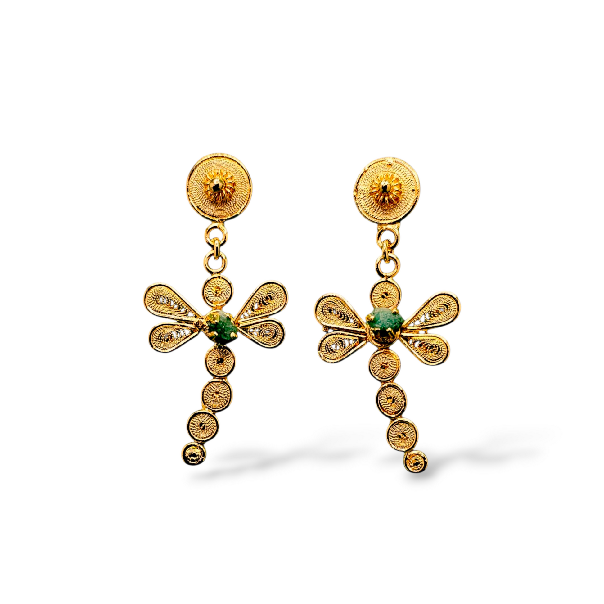 Filigree earrings woven in fine 24k gold-plated bronze threads inlaid with raw emerald