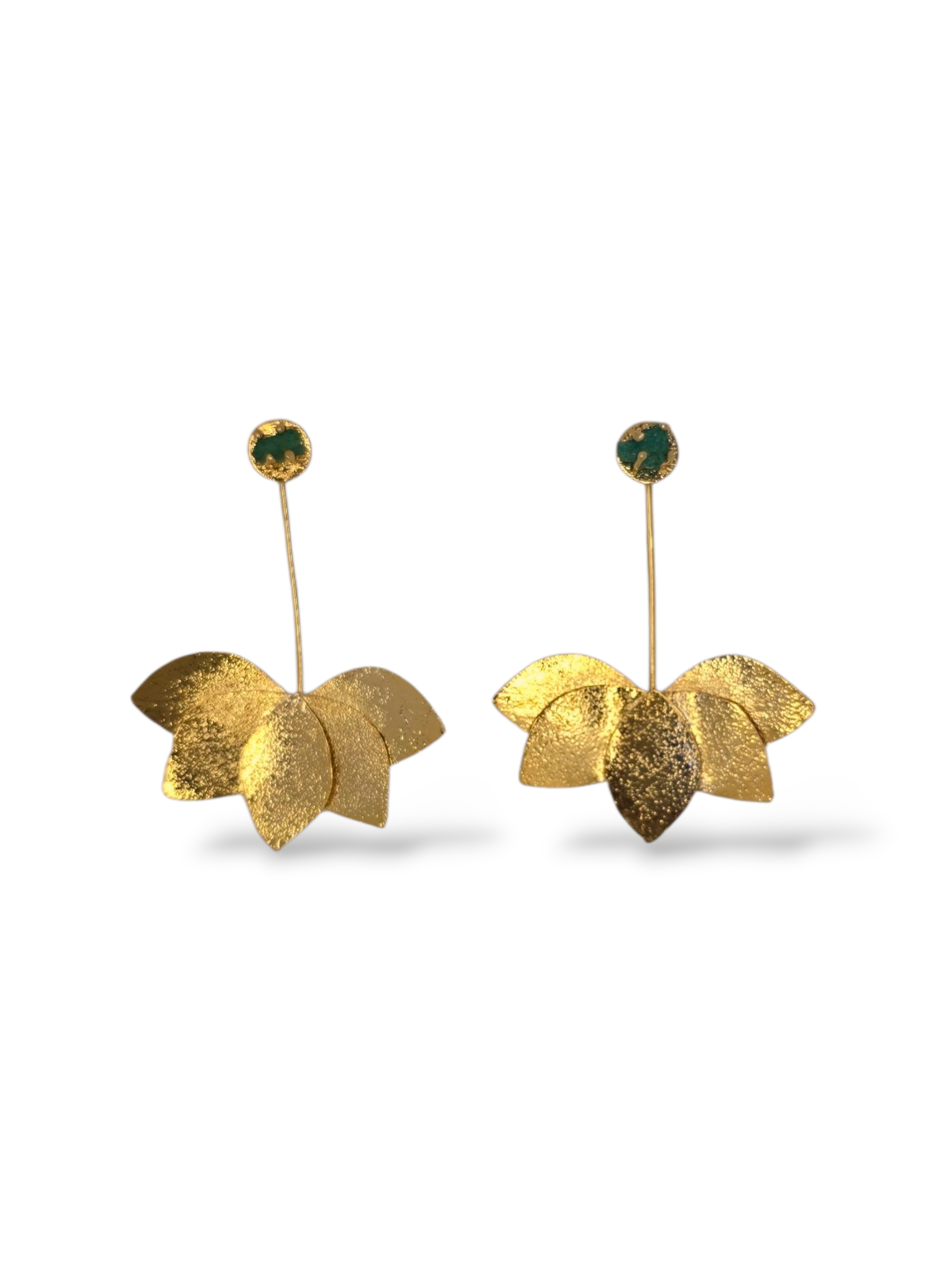 Hammered earrings plated in fine 24k gold inlaid with raw emerald