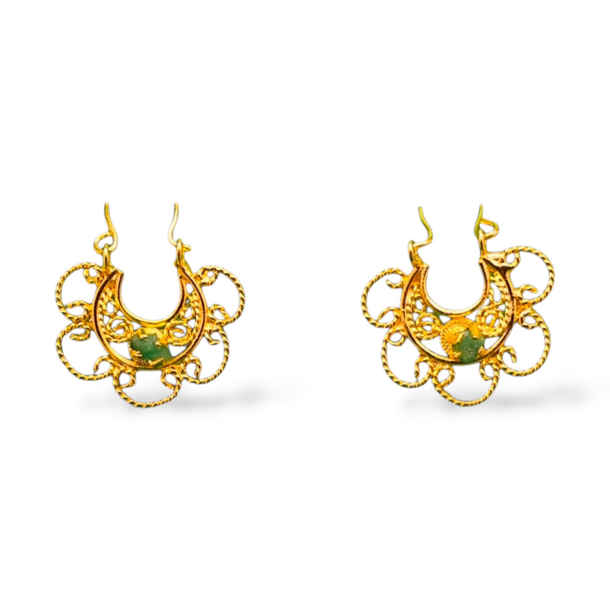 Filigree earrings woven in fine 24k gold-plated bronze threads inlaid with raw emerald