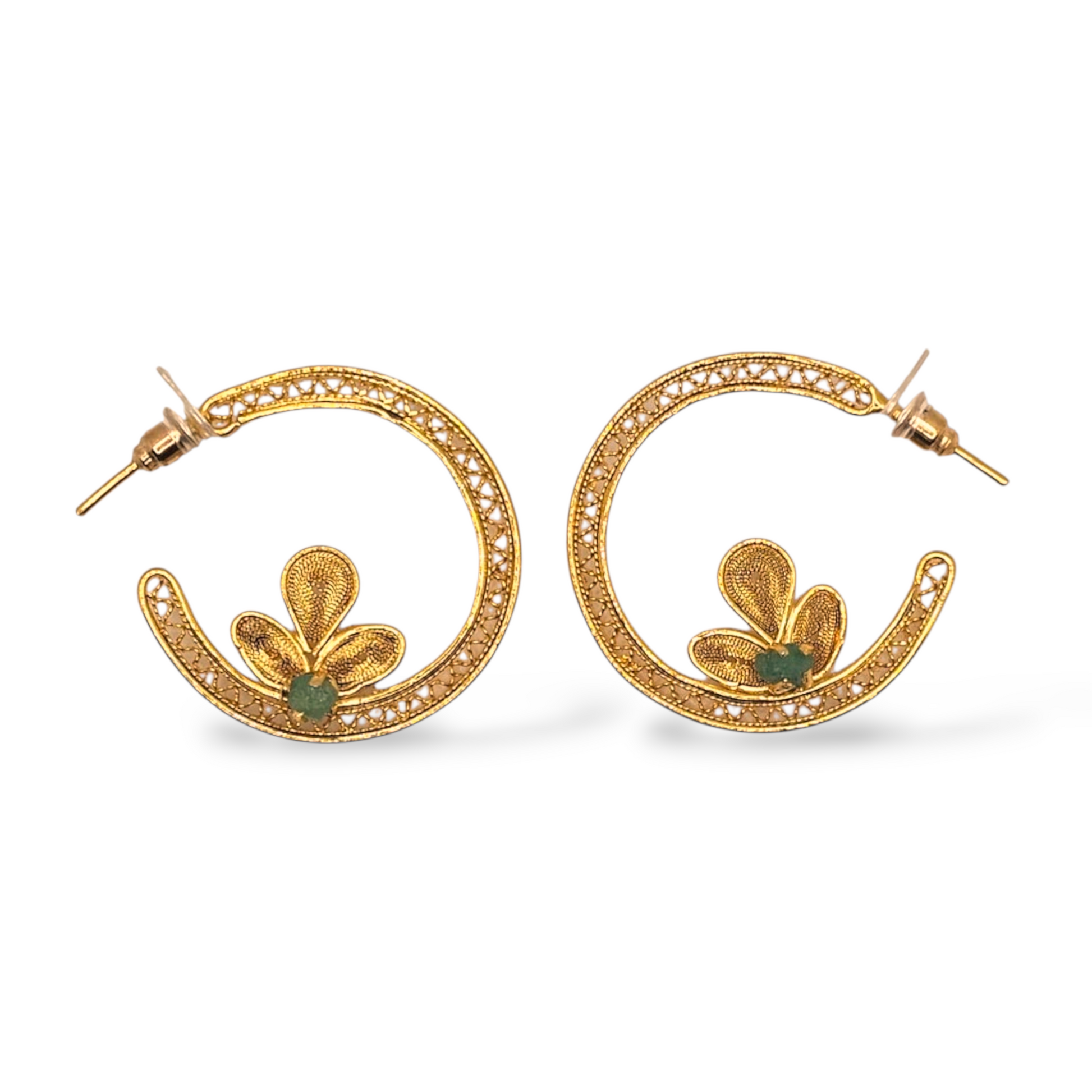 Filigree earrings woven in fine 24k gold-plated bronze threads inlaid with raw emerald
