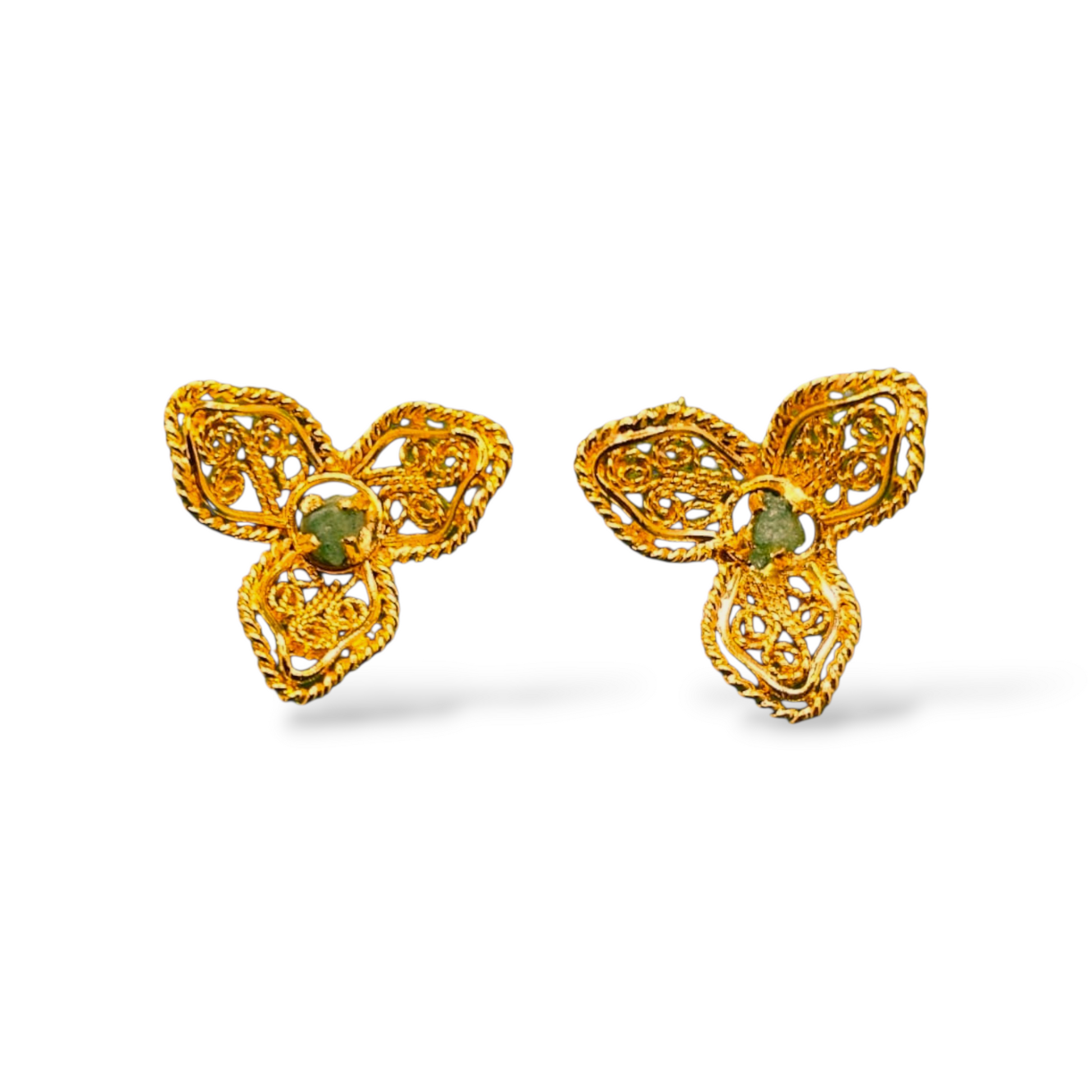 Filigree earrings woven in fine 24k gold-plated bronze threads inlaid with raw emerald
