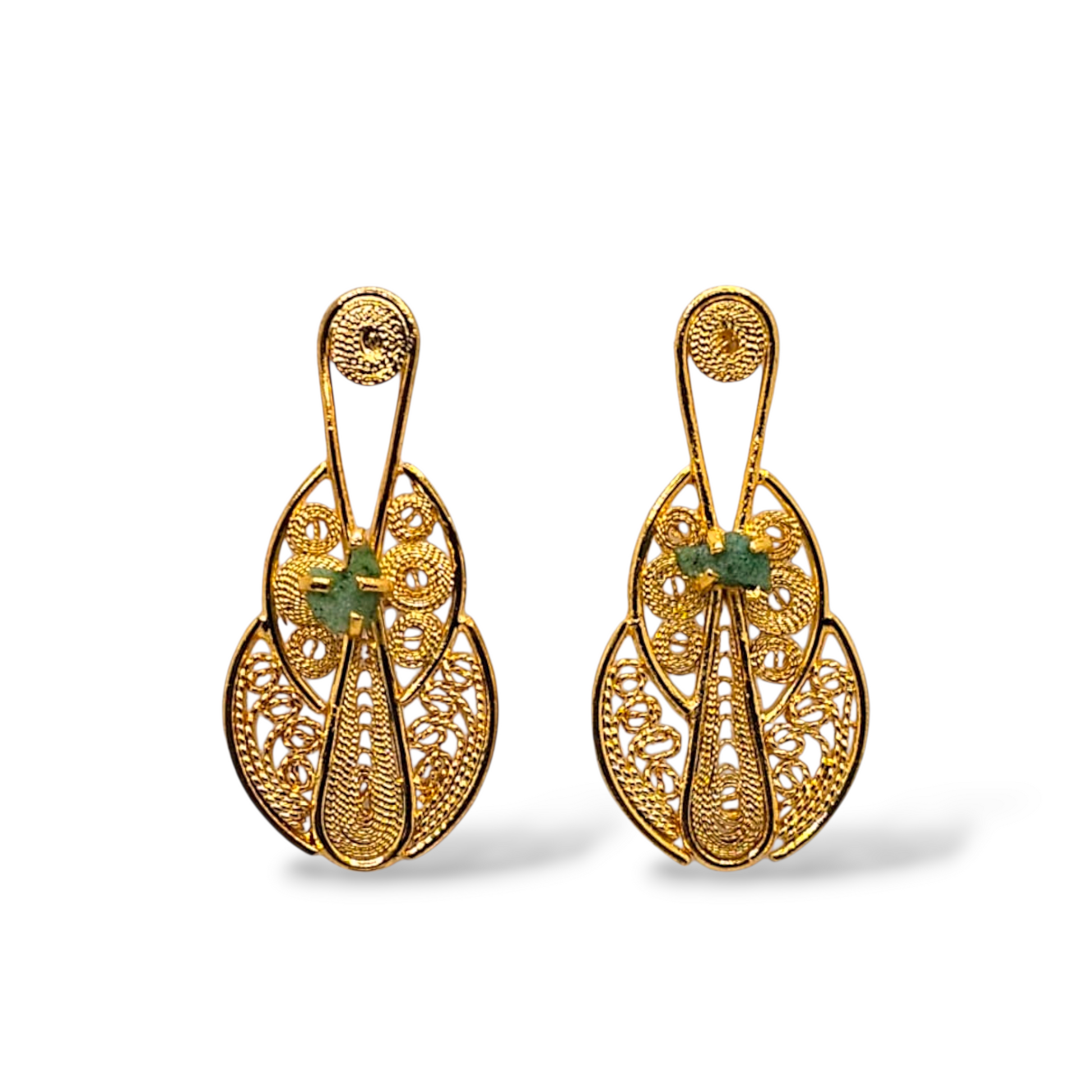 Filigree earrings woven in fine 24k gold-plated bronze threads inlaid with rough emerald
